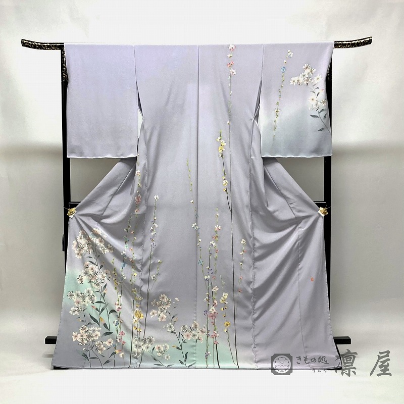 メインから裾へかけては藤色~清涼感のある薄萌葱~深川鼠へとぼかしを入れており、落ち着きある色調の中にミントグリーンがポイントとなり、幅広い年代の方にお勧めいたします。