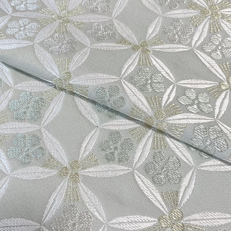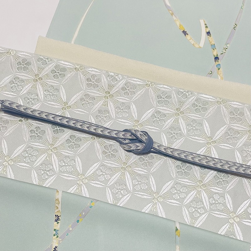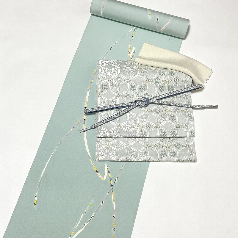 合わせたのは、品のよい淡い青磁鼠の地に松葉、笹の葉、梅の花で構成された変わり七宝文様が織り出された名古屋帯で、清涼感あふれる組合わせにいたしました。