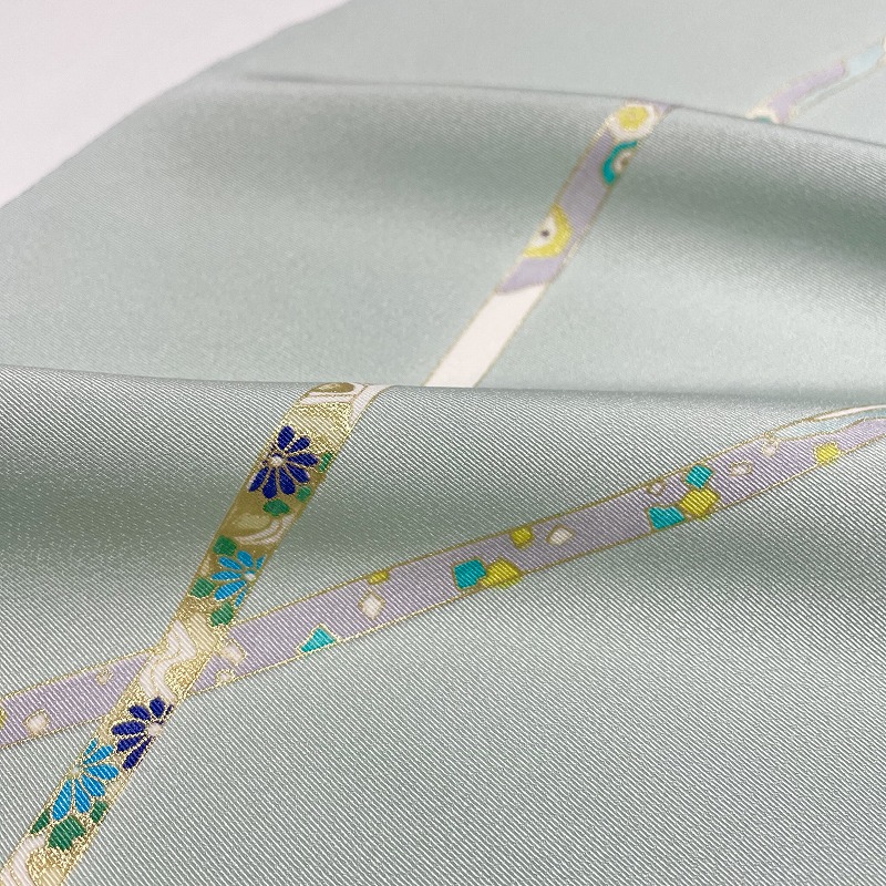 熨斗には松、桜、菊、紅葉、橘、萩など四季折々の草花と、七宝、亀甲、箔散らしといった吉祥文様が非常に繊細な筆致で描かれ、柄のすべては金彩で縁取られておりさりげなく華やか。その色遣いは統一感のある中にピリッと差し色も含まれとても鮮やかで、京友禅ならではのはんなりとした優美で雅やかな雰囲気が漂います