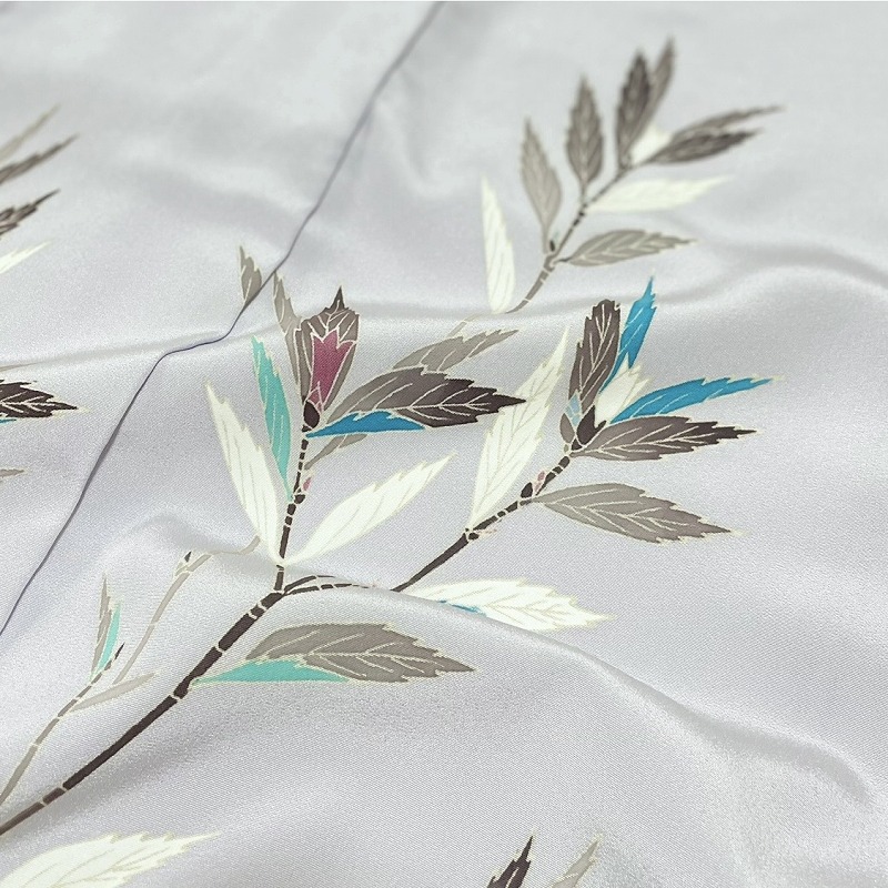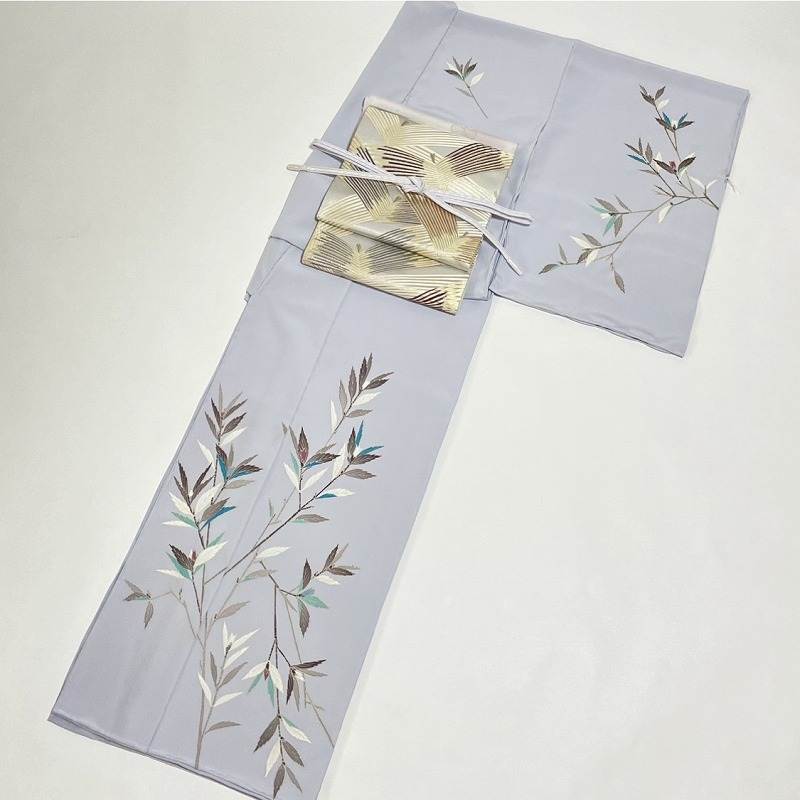 明るい白梅鼠でほのかに紅みを感じる青紫系の地色で、花を咲かせる前の蕾の「ノイバラ」のみが描かれた附下げです。無彩色で表現されたノイバラの葉の中に青磁、翡翠などの目を惹く色が際立ち、洗練された気品が漂います。