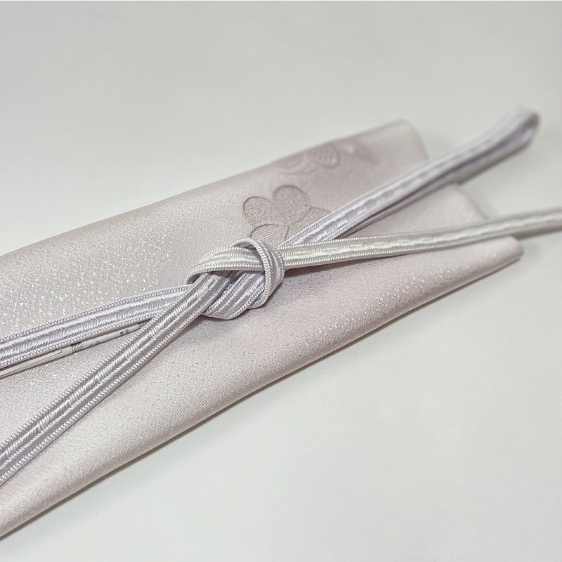帯周りは潔いまでの白い帯締めと灰桜の帯揚げをあわせてみました。留袖に合わせる帯締め帯揚げが白であるように、小物合わせは白に近いほど格が高く高雅なムードが漂います。