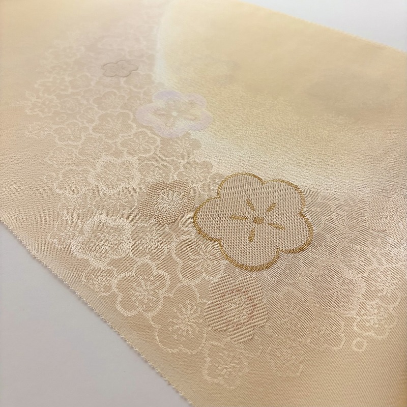 春らしいあたたかなサーモンピンクの地に桜と梅が浮かびます。